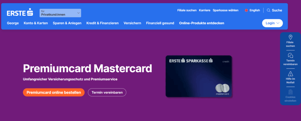 Gehen Sie auf die offizielle Seite der Erste Bank unter sparkasse.at und wählen Sie im Menü „Karten & Kreditkarten“ → „Premiumcard Mastercard“.