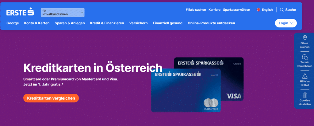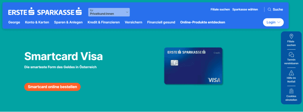 Rufen Sie die offizielle Seite für Kreditkarten auf (Sparkasse / Erste „Karten & Kreditkarten“) und wählen Sie dort Smartcard Visa. Sparkasse+2Sparkasse+2