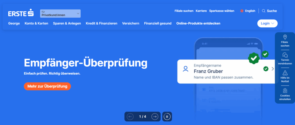 Für Online-Einkäufe nutzt Erste Bank das 3D Secure Visa System zur Zusatzprüfung. Diese Authentifizierung erfolgt oft per App oder SMS, was Betrugsrisiken bei Internettransaktionen verringert.