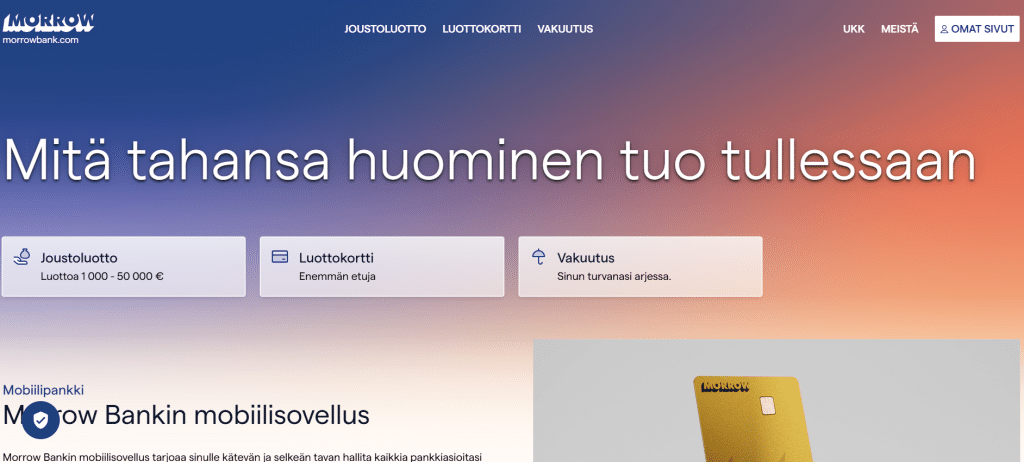 Morrow Bankin kortti hyväksytään laajalti ja se tarjoaa huipputason turvallisuutta. Kortilla saa myös mobiilimaksutuen. Lisäksi asiakkaille tarjotaan ostosuojaa ja matkavakuutusta.
