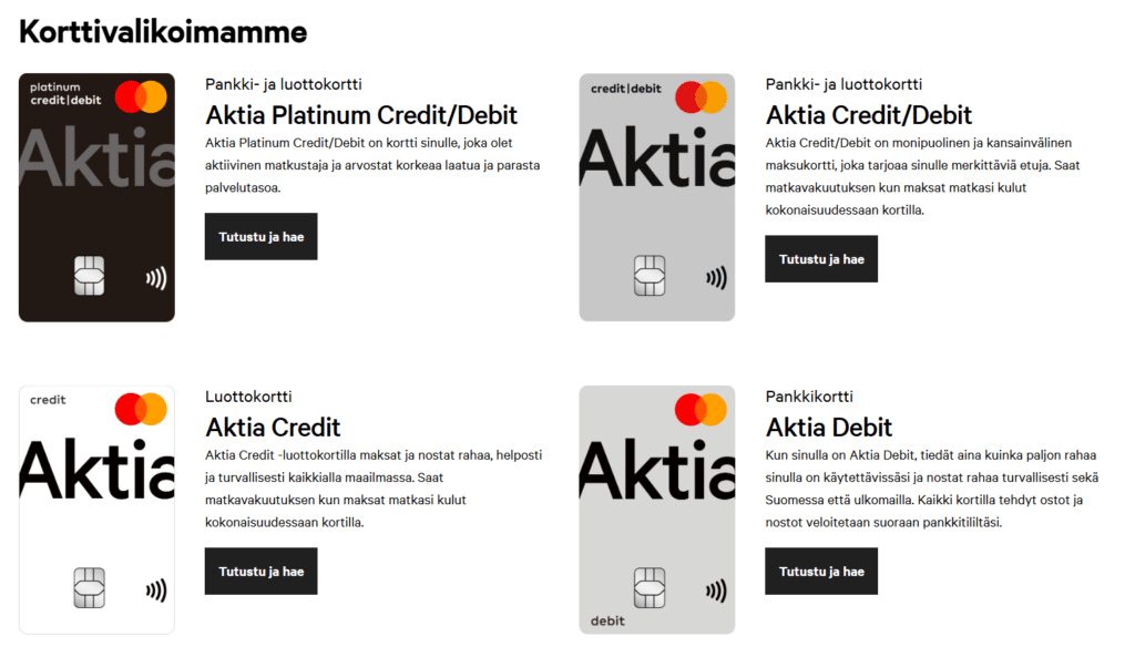 Ennen päätöksentekoa, muista tarkistaa uusimmat ehdot ja korttivalikoima Aktian verkkosivuilta.