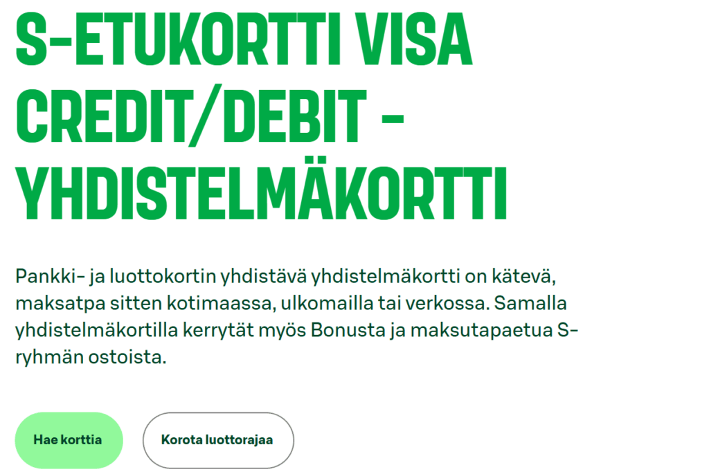 - S-ryhmän asiakasomistajuus: ei pakollinen itse korttiin, mutta suositeltava Bonuksen ja maksutapaedun vuoksi.