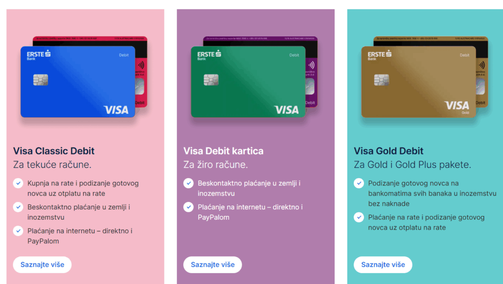 Visa mreža daje prednost pri prihvaćanju u inozemstvu nasuprot nekim domaćim rješenjima. Ipak, provjerite konkretne naknade Erste Bank u odnosu na ponude Zagrebačke banke, PBZ-a ili drugih pružatelja.
