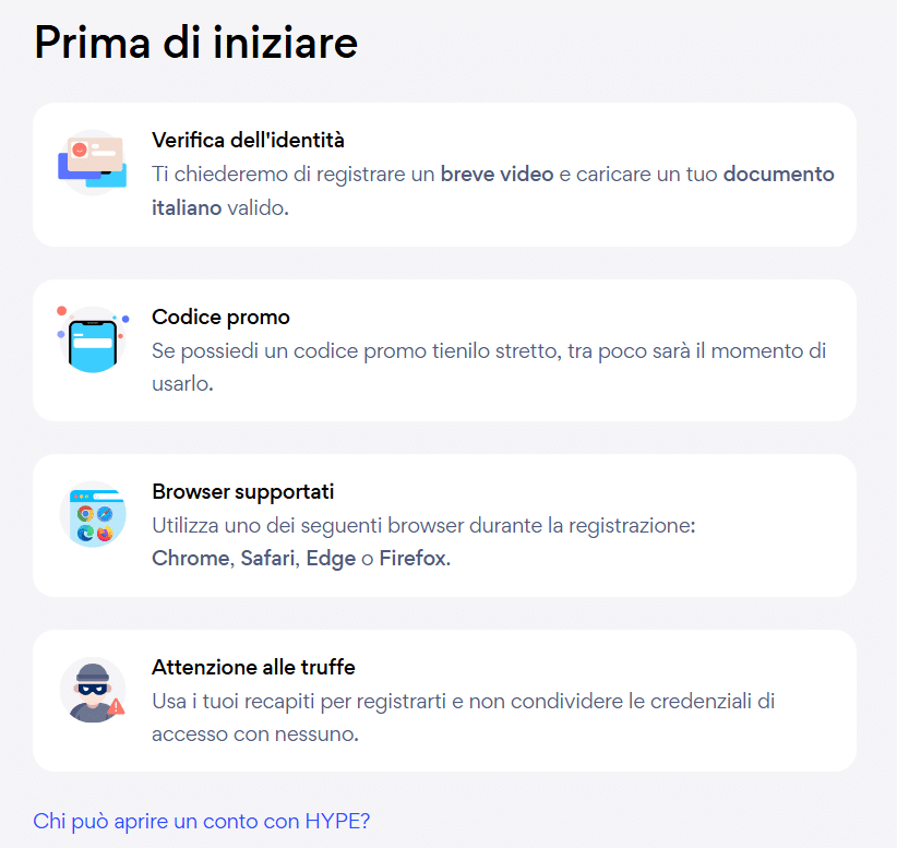 Occorre possedere uno smartphone compatibile con iOS o Android e una connessione internet stabile. Le norme antiriciclaggio richiedono identificazione del cliente, perciò la procedura vale per residenti in Italia e richiede i documenti per Hype sopra elencati.