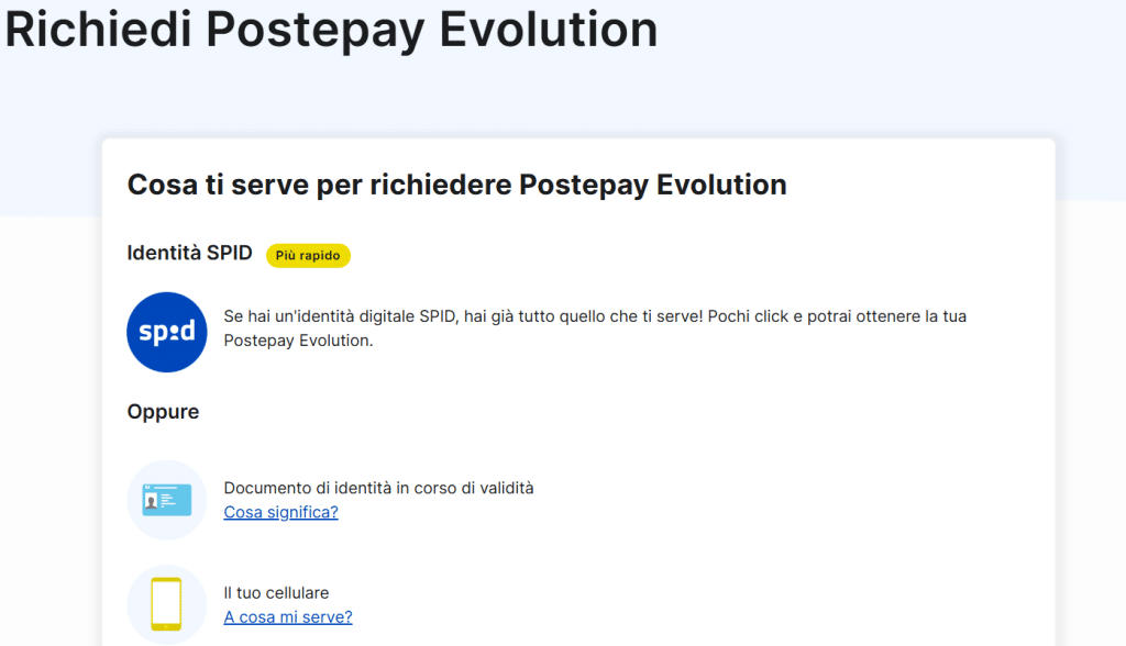 - Online (consigliato): accedi all’App Poste Italiane o al sito poste.it / postepay.it, seleziona “Postepay Evolution” e segui la procedura guidata passo per passo.