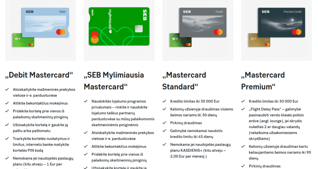 SEB siūlo įvairias kortelių grupes. Pavyzdžiui, yra debetinės kortelės, kredito kortelės, virtualios kortelės. Taip pat galite gauti papildomas kortelės šeimos nariams ar verslo kortelės. Debetinė kortelė tinkama kasdieniams pirkimams. Kredito kortelė dažniau naudojama laikinoms išlaidoms.