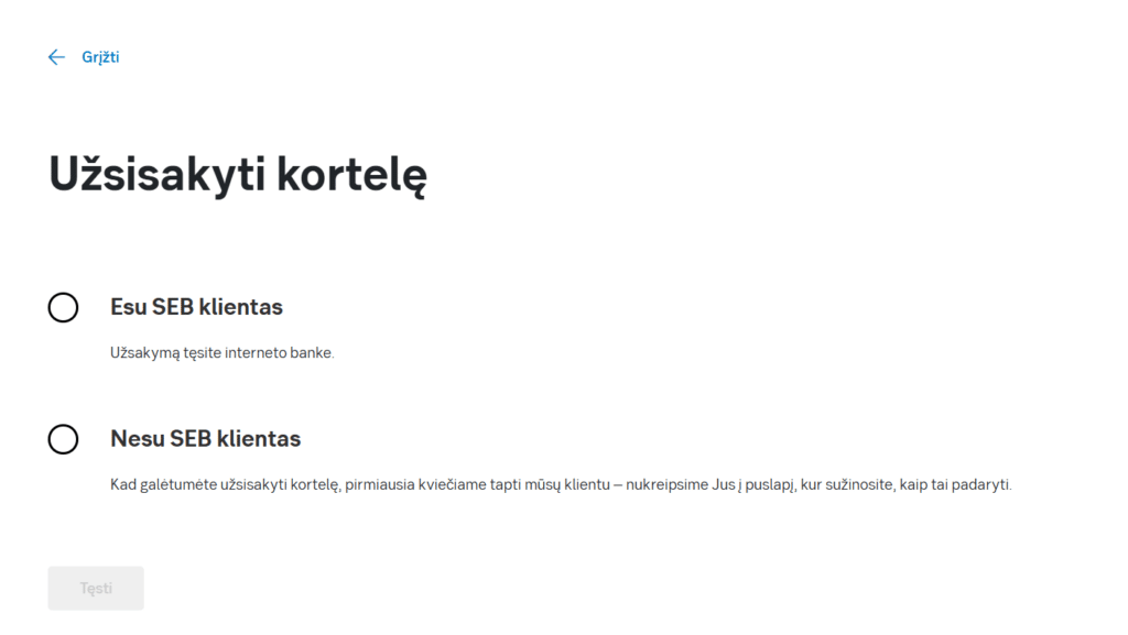 Pasirinkite norimą kortelės tipą. Čia galite pasirinkti debeto kortelę, Premium kortelę ar kitą SEB siūlomą kortelės variantą.