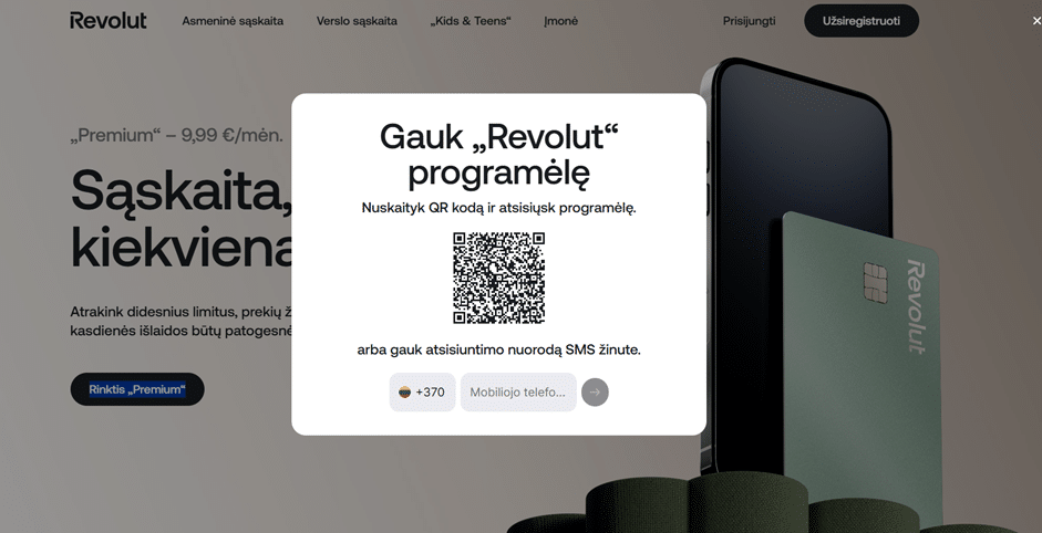 Atsisiųsti Revolut galite iš App Store ar Google Play. Kai atsisiųsite, paleiskite programėlę ir pasirinkite „Sign up“ arba „Create account“. Įrašykite savo telefono numerį, gaukite patvirtinimo SMS ir sukurkite slaptažodį.