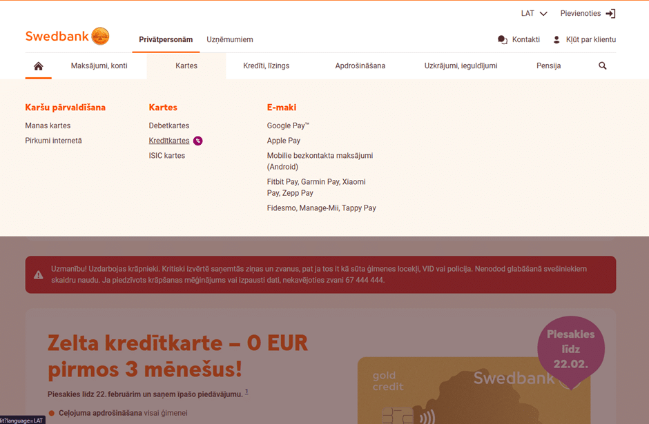 Apsilankykite oficialioje banko svetainėje swedbank.lv/private. Apatiniame meniu susiraskite ir pasirinkite priešpaskutinę parinktį „Kort“ (Kortelės).